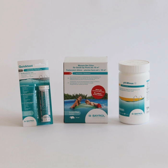 - Analyse de l’eau avec les 50 bandelettes d’analyse Quicktest Bayrol qui permettent une analyse de l’eau de la piscine simple et rapide et mesurent le pH, le TAC, la concentration en chlore et en algicide,