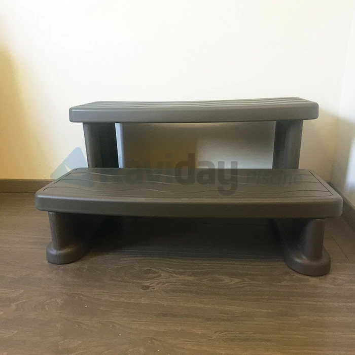 Raviday vous propose le marche-pied développé par Cover Valet, spécialiste en équipement pour spa. Ce marche-pied s’adapte à tout type et toute forme de spa. Que vous ayez un spa gonflable ou rigide, qu’il soit rond ou carré, le marche-pied est modulable. En effet le dessus des marches est interchangeable. Une marche est droite, l’autre est arrondie.