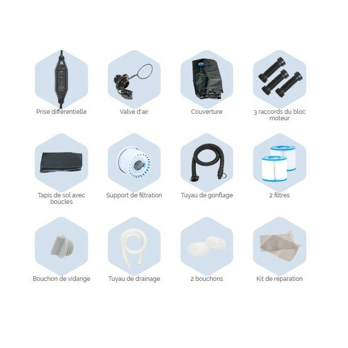 Ainsi vous retrouverez avec celui-ci : prise différentielle, valve d’aire, couverture thermique sécurisée, 3 raccords du bloc moteur, tapis de sol à isolation thermique, support de filtration, tuyau de gonflage, 2 filtres, bouchon de vidange, tuyau de drainage, 2 bouchons, kit de réparation