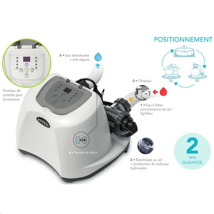 - Simple d’utilisation : il suffit de le raccorder à un système de filtration (minimum 1m3/h et maximum 3,8m3/h) et d’ajouter du sel (non inclus) à votre bassin. Le programmateur se charge de faire fonctionner l’appareils tous les jours. Les voyants lumineux et l’alarme indiquent un éventuel dysfonctionnement (manque de sel)